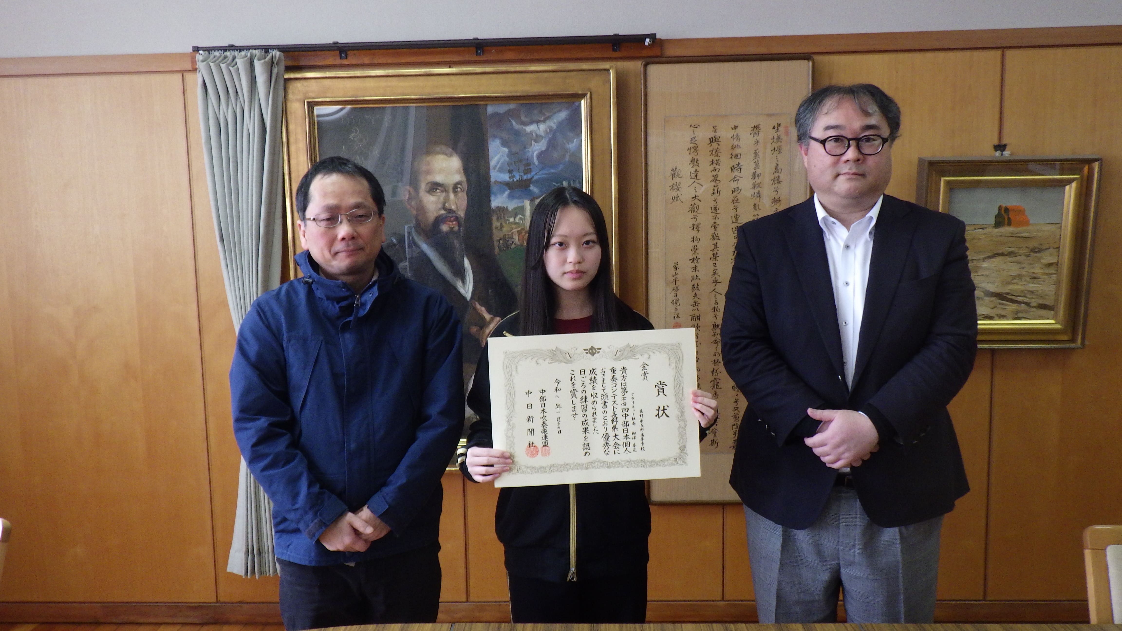 第24回中部日本個人・重奏コンテスト、クラリネット独奏で金賞を受賞 2026.01.27 長高生の日常 2年2組の柳澤春花さんは、第24回中部日本個人・重奏コンテストにクラリネット独奏で出場し、見事に金賞を受賞、長野県代表となったことを学校長に報告しました。おめでとうございます。