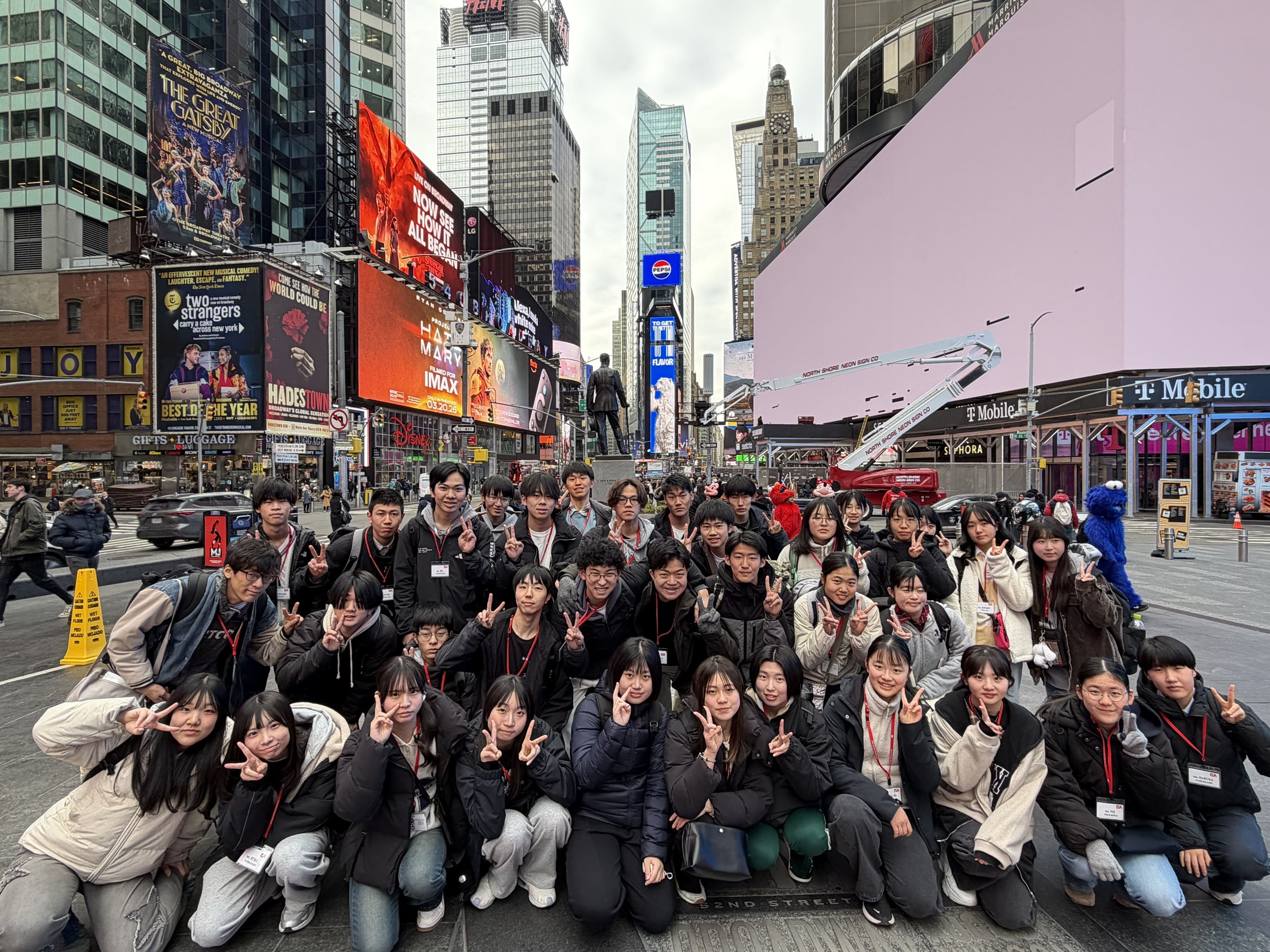 研修5日目。アメリカで過ごす最後の1日です。これまでの学びと経験を踏まえ、研修の総仕上げとして一日を過ごしました。まずはニューヨークを象徴するTimes Squareを班別で巡りました。午前9時過ぎに到着し全体で記念撮影を行った後、集合場所や安全面の確認を徹底した上で、約2時間の自由行動としました。戻った生徒の様子からは、充実した時間を過ごしたことが伺えました。ディズニーショップやM&M’s、チョコレート専門店などで家族や友人への土産を選ぶ姿が多く見られたほか、記念に衣類や小物を購入するなど、それぞれがニューヨークの思い出を形に残していました。